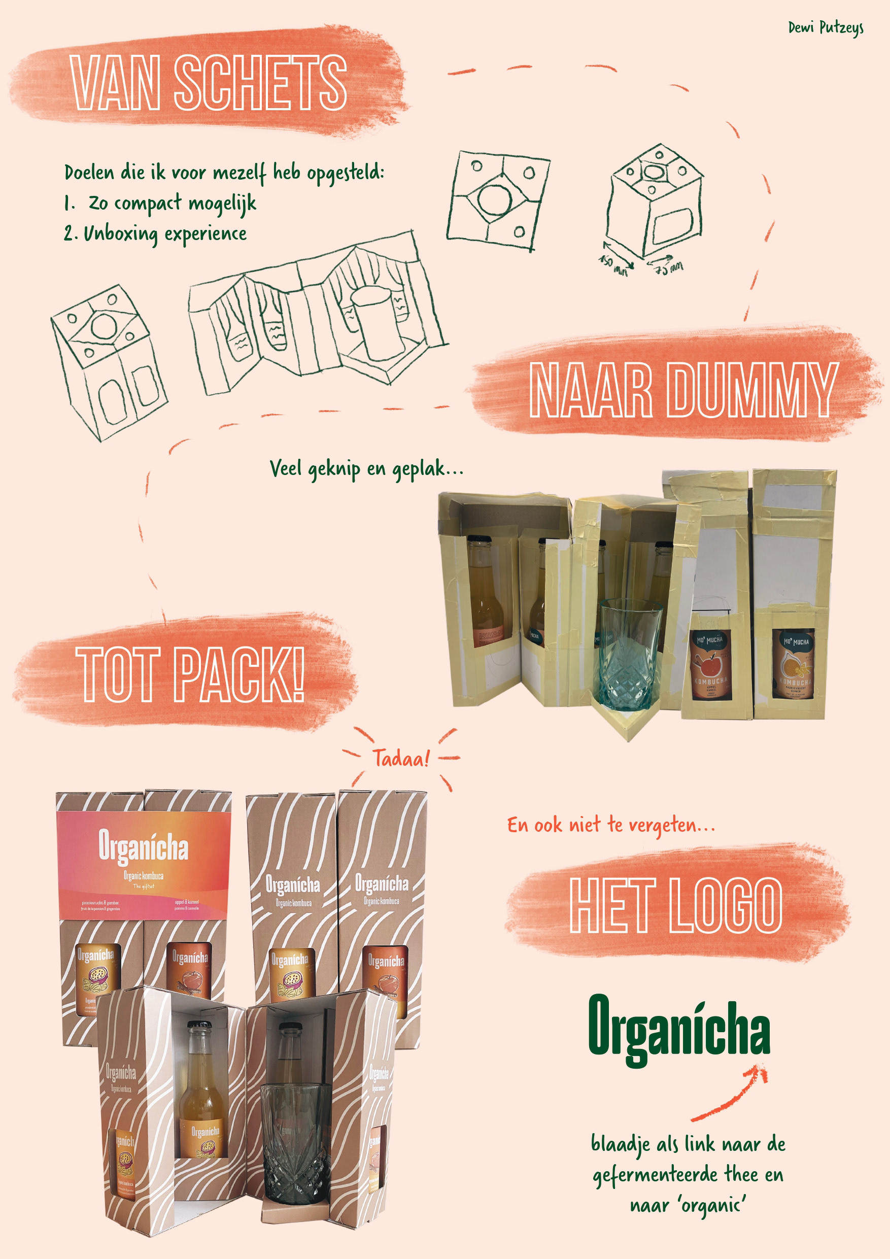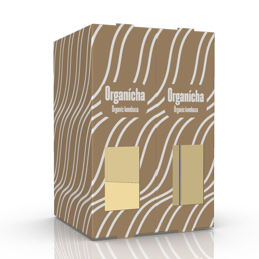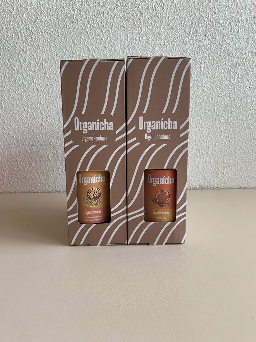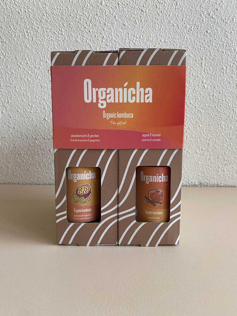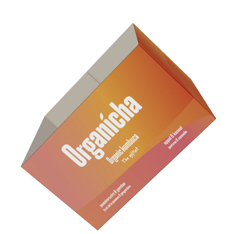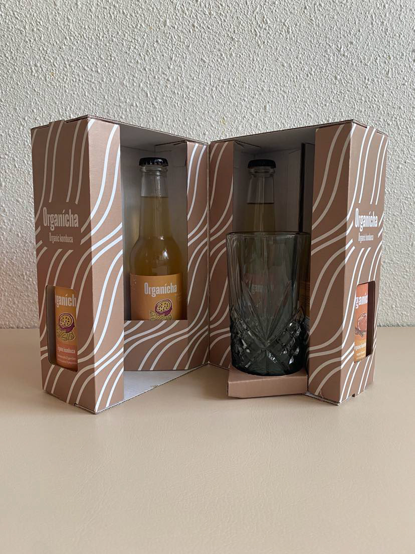 Een verpakking voor 4 flessen Kombucha en een bijbehorend glas waarbij de unboxing experience centraal staat.